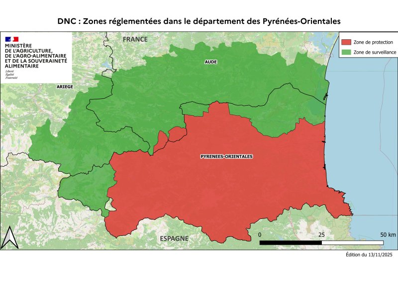 - ZV-5 (Ain) : Zone vaccinale à compter du 30 novembre 2025. Date du dernier (et unique) foyer dans la zone règlementée (ZR5*) : 14 octobre (1 foyer)