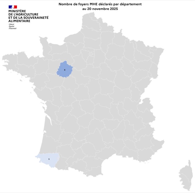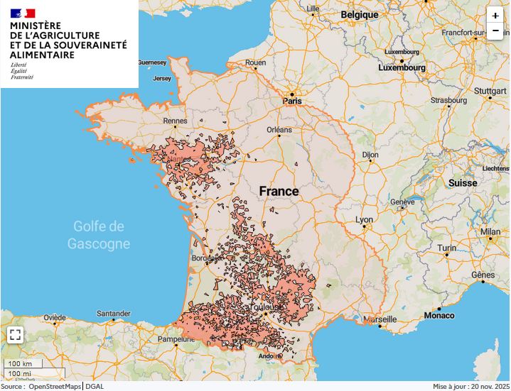 La zone régulée MHE évolue légèrement le 02/10/2025 suite à la prise en compte de nouveaux foyers dans la Sarthe. Les communes impactées sont dans le 76 et le 27.