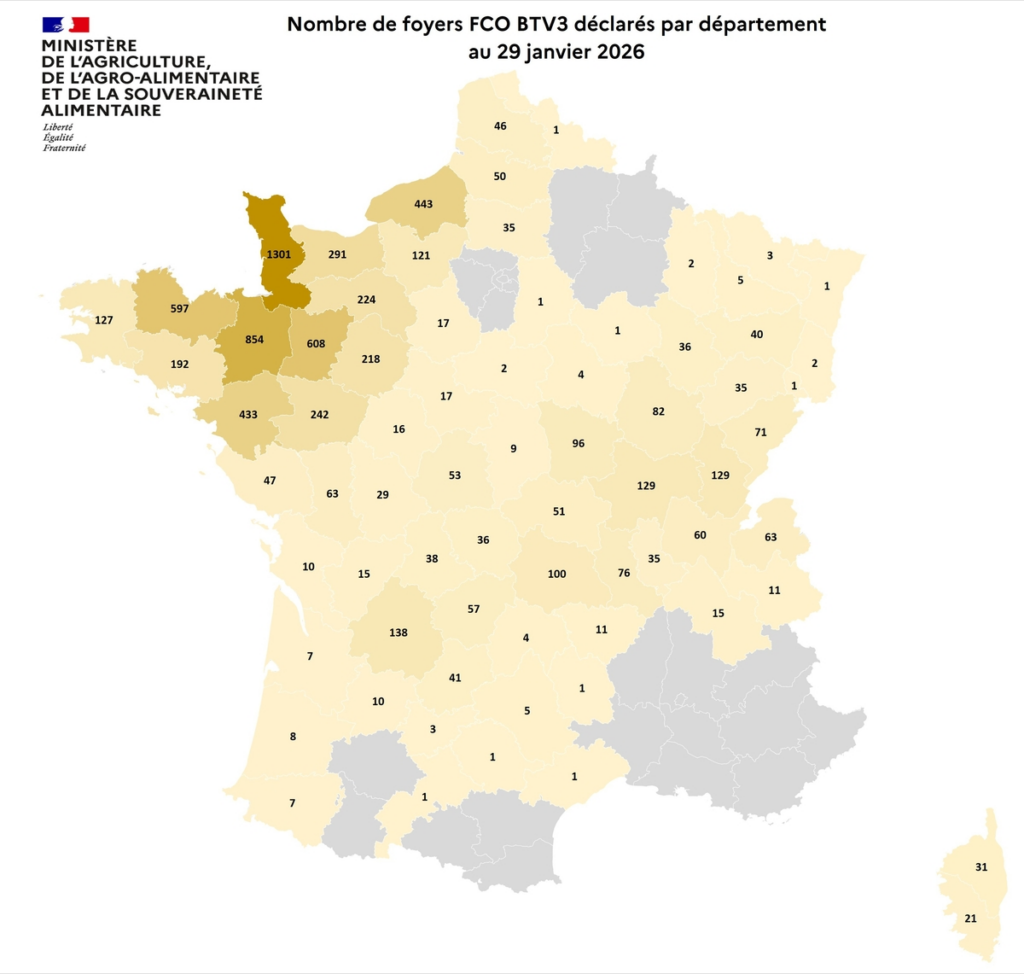 Entre le 1er juin et le 29 janvier 2026, 7 531 foyers de FCO, sérotype 3, ont été recensés en France. Entre le 5 août 2024 et le 1er juin 2025, 10 813 foyers avaient été recensés.