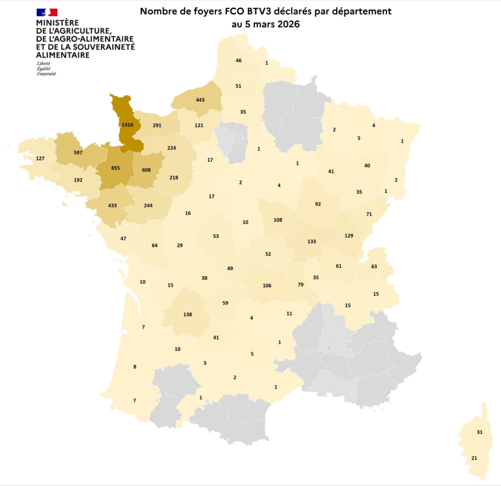 Entre le 1er juin et le 5 mars 2026, 7 609 foyers de FCO, sérotype 3, ont été recensés en France. Entre le 5 août 2024 et le 1er juin 2025, 10 813 foyers avaient été recensés.